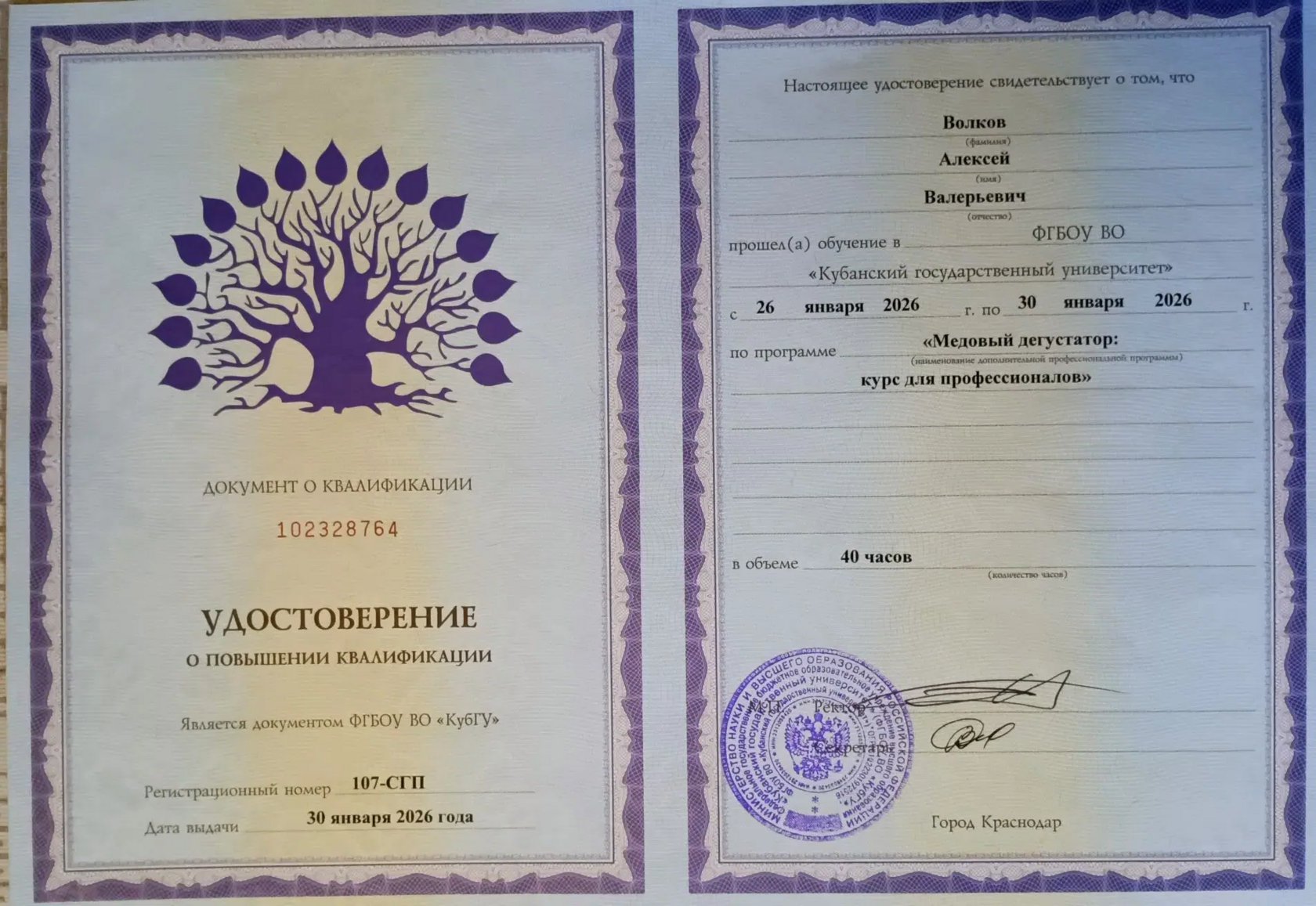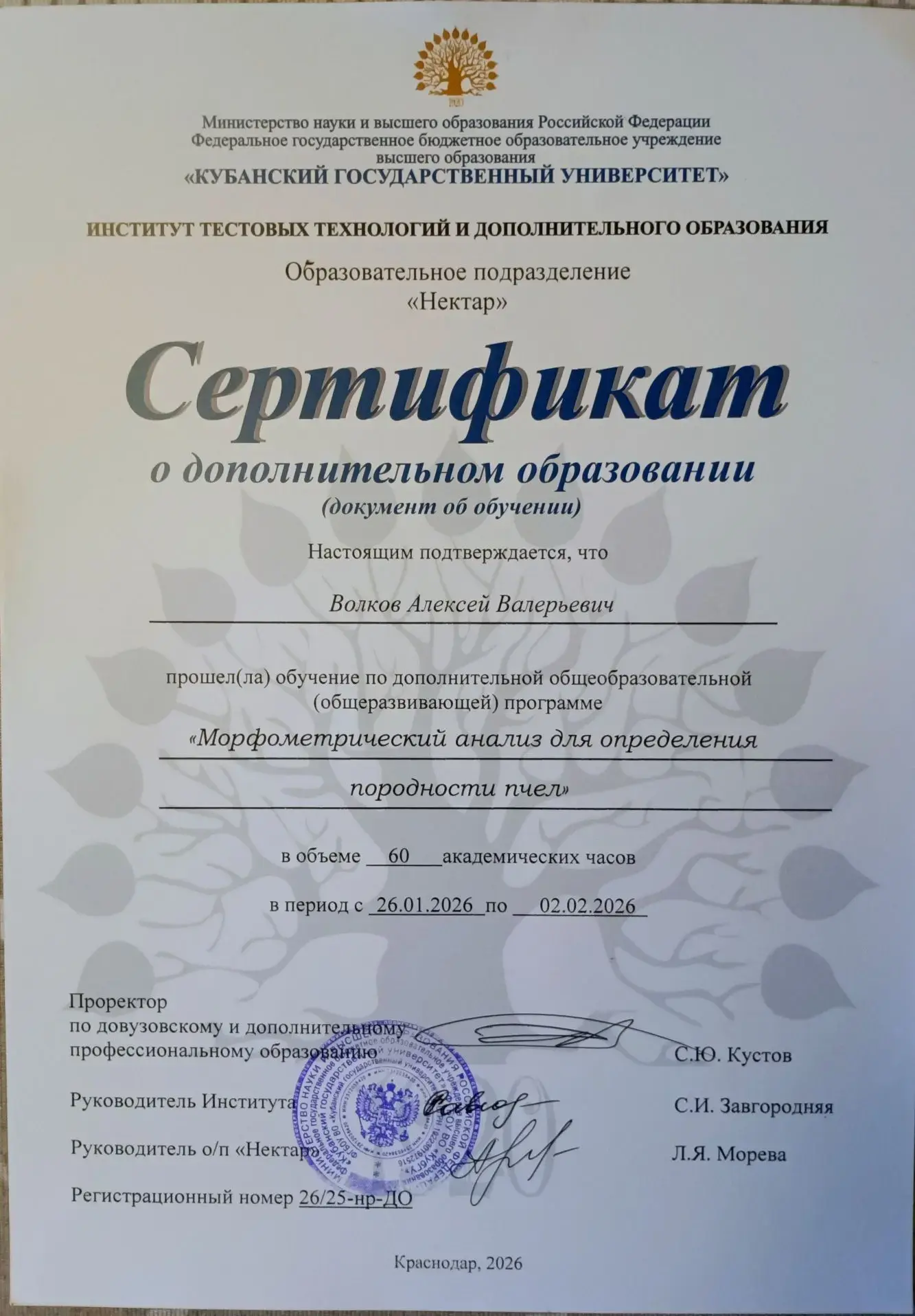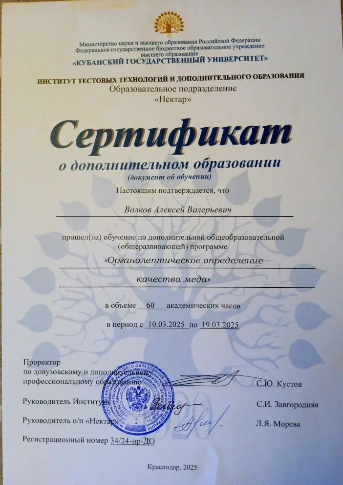 | Волков Алексей Пчеловод, медовый дегустатор профессионал, мелиссопалинолог, специалист по морфометрии пчёл, выпускник "Школы Фермеров", старший куратор курса Эко-Пчеловодство Потомственный пчеловод в 4 поколении, личный стаж пчеловодства более 17 лет. Создал семейный бренд «Пасека Волковых», создал с нуля пасеку. К 2023 году полностью перевёл её на ЭКО-стандарт. Медоносных зимующих семей в сезоне 2025-2026 более 50 в сезон более 200. На двух отдельных пасеках. Содержит три типа ульев, создаёт колоды. Ведёт селекционную работу по выявлению семей, устойчивых к клещами и болезням. Работает над созданием своих инструментов и оборудования. Обрабатывает более 50 га земли полей и лугов для медоносов. Развивает социальные сети с нуля, достиг успехов в продажах через 2 месяца после начала ведения. Имеет опыт реальных продаж через соцсети и сеть интернет. Старший куратор на курсе ЭКО-Пчеловодство 3.0, ПчёлУниверсити. Выпускник "Школа фермеров", член Ассоциации Медовых Дегустаторов, официальный представитель Ассоциации Медовых Дегустаторов по Тверской области, член Союза пчеловодов и пчеловодных организаций страны «Пчеловодство», член Союза Пчеловодов России. |